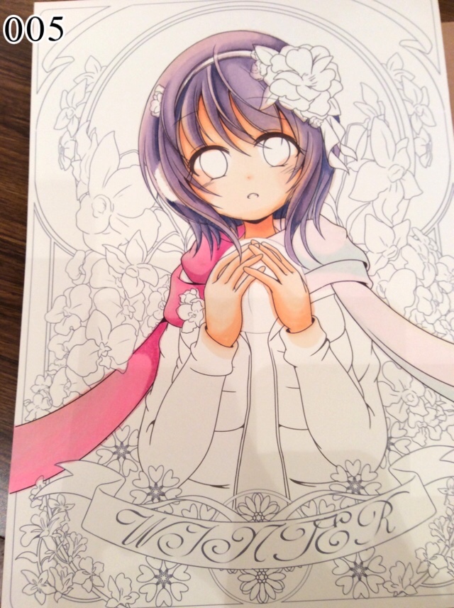 髪と同じく、線で区切られた部分を一気に塗っていきます。左はあらかた塗り終えたもの、右は一番薄いピンクをおいた状態です。少しずつ濃い色を重ねてなじませていきます。