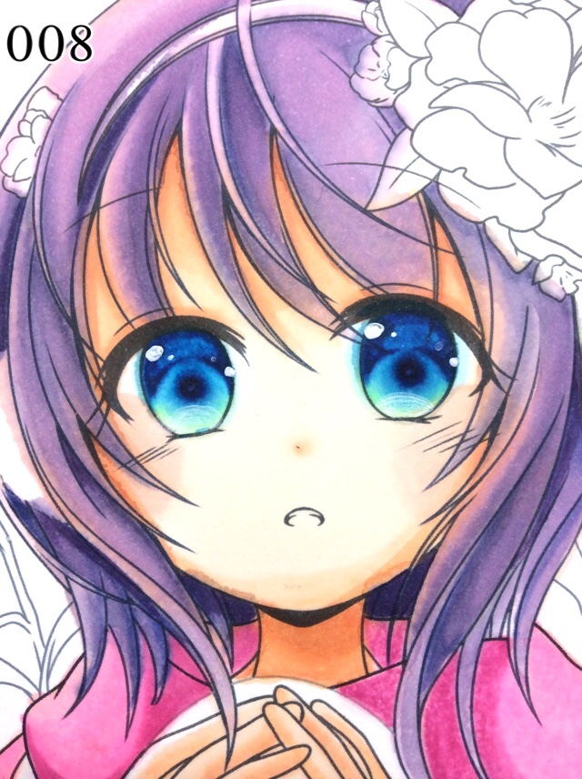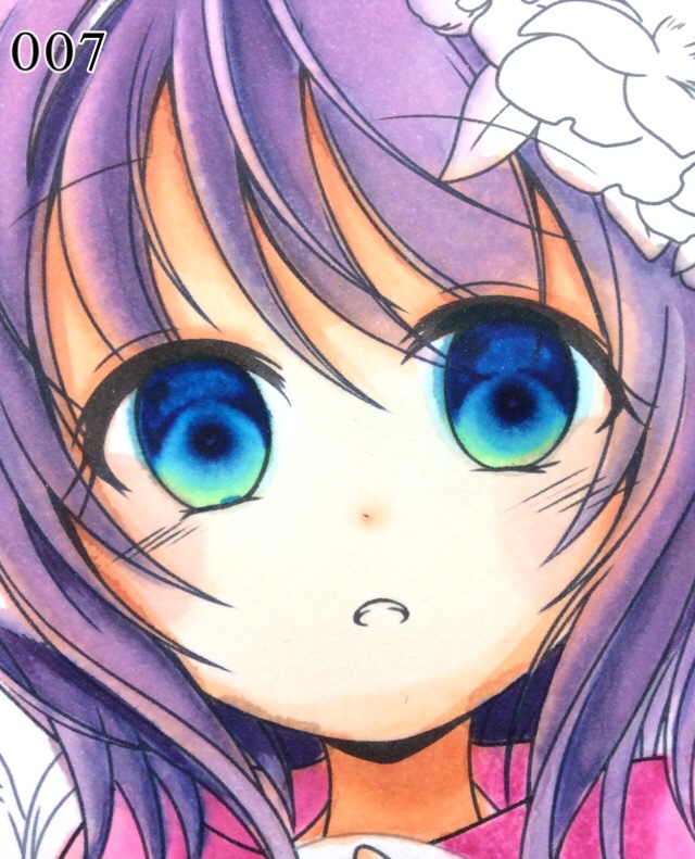 瞼の影がおちる部分、瞳孔を中心に濃い色を重ねていきます。塗る場所と塗らない場所をはっきりと決めて、最後に薄い青色で境目をぼかすといいかと思います。