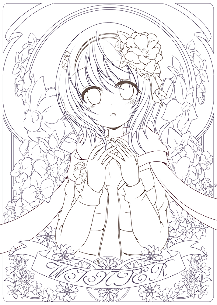 clip studio paint pro でラフを開き、それを元に線画を制作いたしました。レイヤーは後々調整がしやすいように、人物は目や髪、飾りなど多めにわけて描画、背景はバランスを見つつ書きこんでいくため、適度に結合しつつ制作いたしました。アナログ彩飾、デジタル彩飾でもここらへんはあまり変わりません。